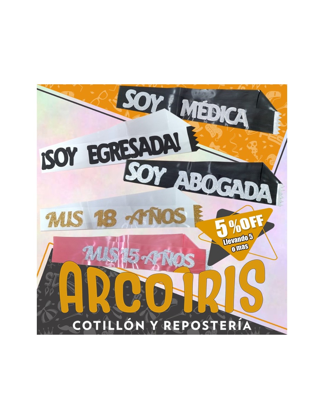 BANDA CINTA LETRAS GIBREADAS 72 CM +5-5% - VARIOS MOTIVOS UPD EGRESADO PROMO POR CANTIDAD CINTA MI CUMPLE/EGRESADO/ME RECIBI/SOY ABOGADA/O/SOY ARQUITECTA/O/MIS15/MIS18/SOY LICENCIADA/O/SOY MEDICA/O/NUESTRA BODA/SOY JUBILADO/O/ME JUBILE/