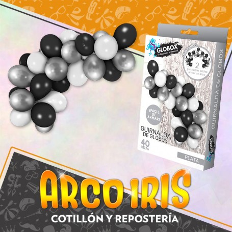 GUIRNALDA DE GLOBOS 12` PLATA X 40 PIEZAS CON 2 GUIRNALDA ARMAS UN ARCO 39 GLOBO PERLADO 12` 13 PLATA 13 NEGRO 13 BLANCOS INCLUYE 5 MT DE CINTA ORGANICA GLOBOX