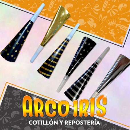 CORNETA HOLOGRAFICA 20 CM X 6 - LUNAR RAYAS DORADO PLATEADO NAVIDAD GAPE